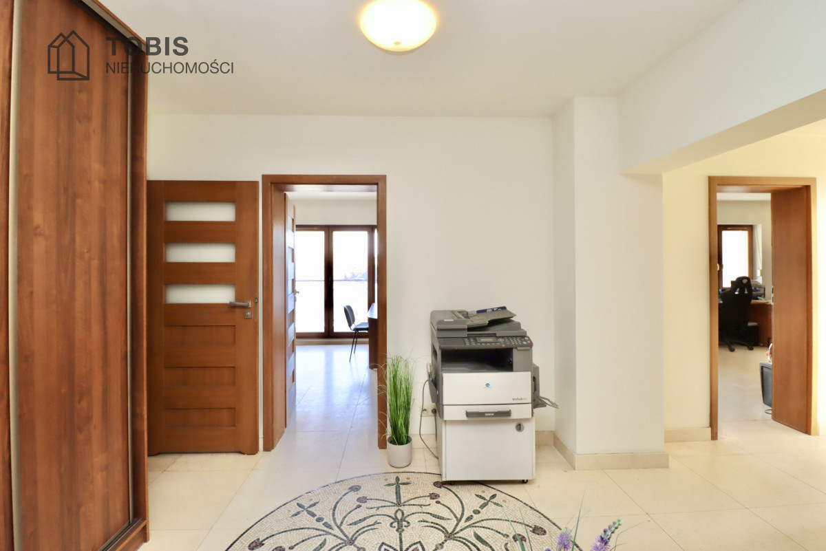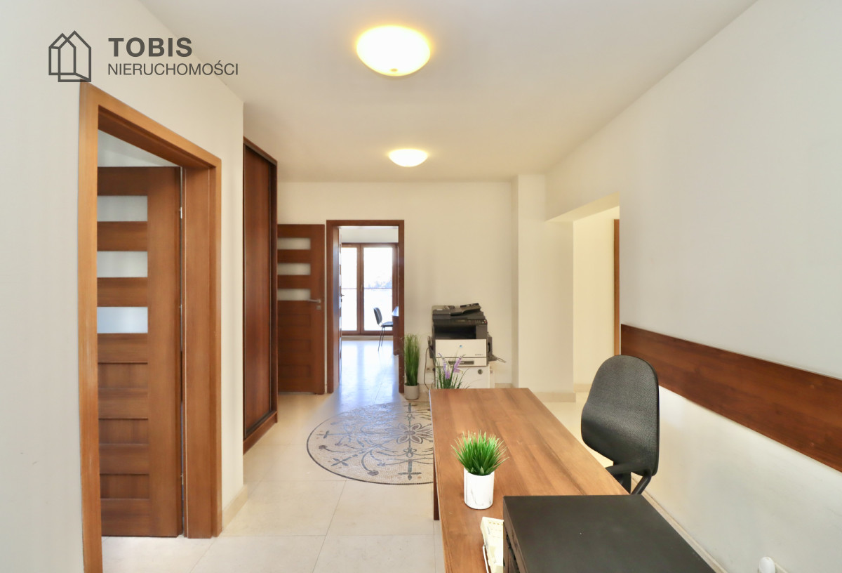 DLA KLIENTA BIZNESOWEGO (Biuro, Stomatologia, Gabinet): Reprezentacyjny hol o powierzchni niemal 20 m² idealnie sprawdzi się jako recepcja z poczekalnią. Układ gabinetowy pozwala na wydzielenie niezależnych stref pracy lub zabiegowych. Przeszklone drzwi i nowoczesne oświetlenie budują profesjonalny wizerunek firmy.