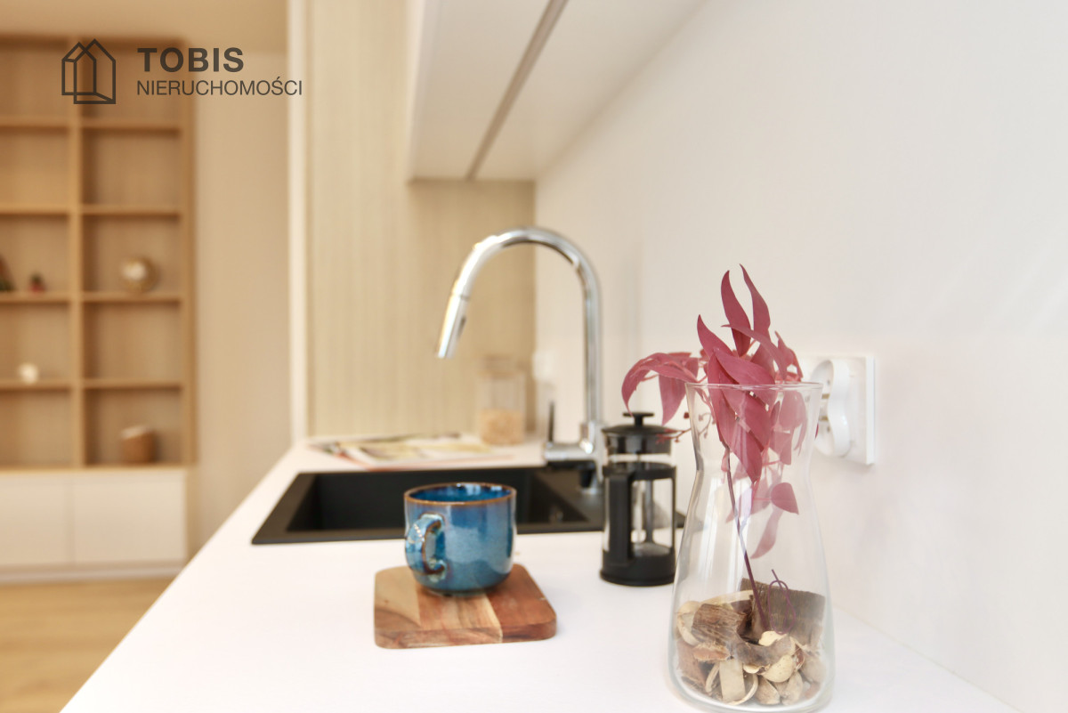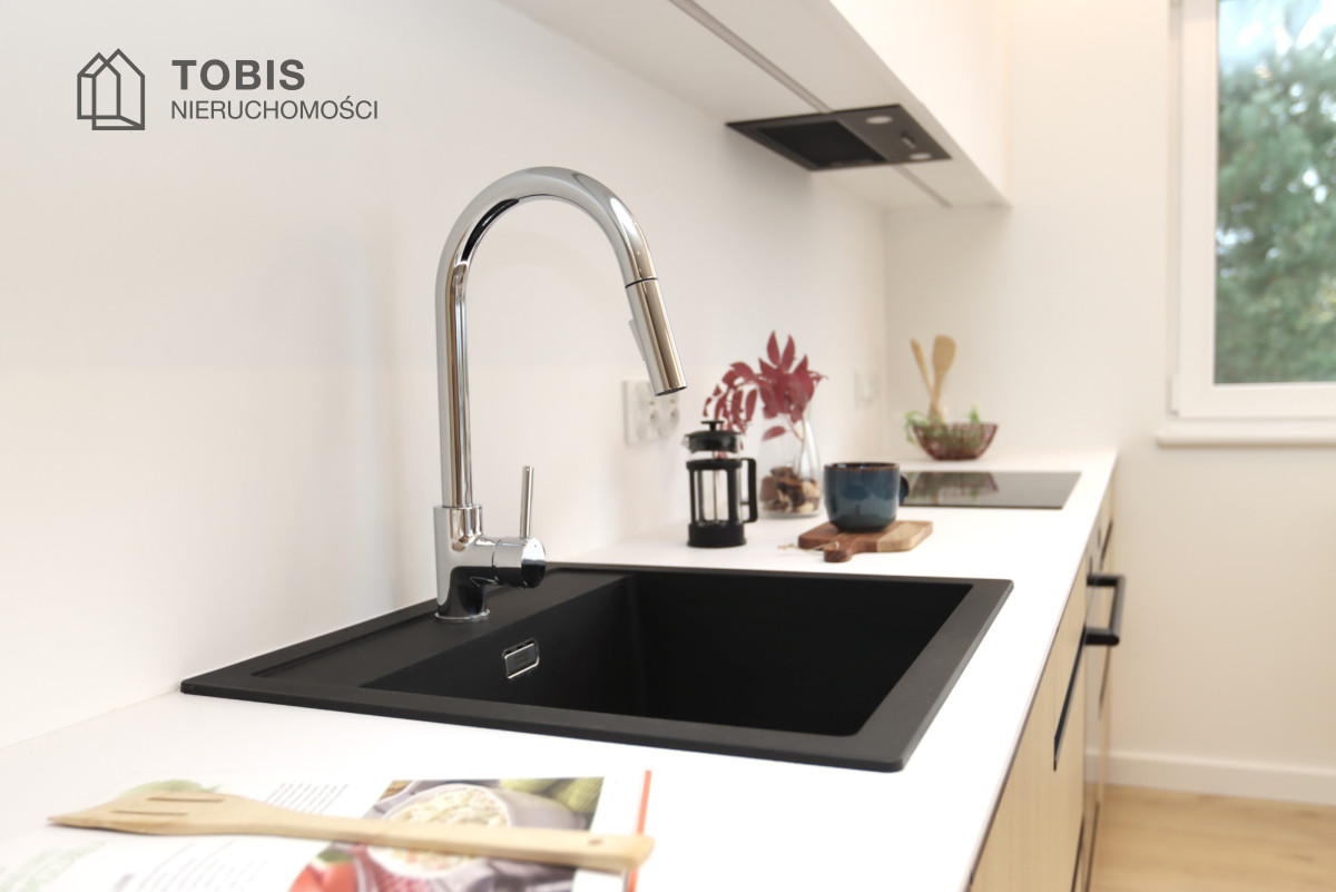 • Designerska Kuchnia: Minimalistyczna zabudowa kuchenna łączy białe, gładkie fronty z dolnymi szafkami w naturalnym odcieniu jasnego drewna. Wyróżnia ją czarny granitowy zlewozmywak i nowoczesne sprzęty.