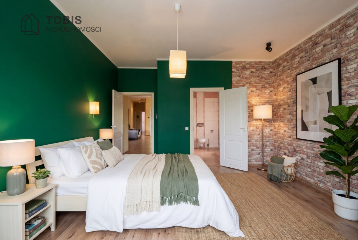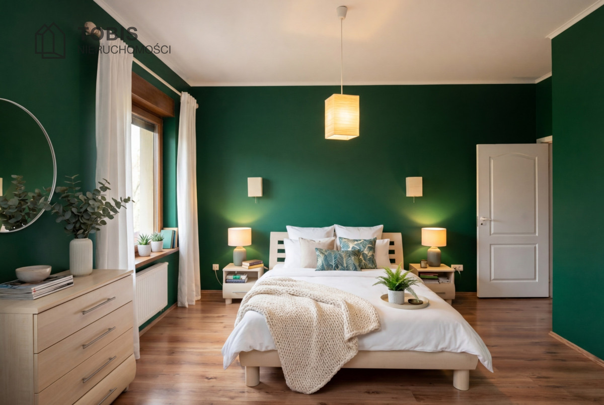 Strefa dzienna stanowi otwartą, wygodną przestrzeń do życia, a część prywatna została wyraźnie oddzielona. Sypialnia główna pełni funkcję komfortowej przestrzeni dla właścicieli – z możliwością wydzielenia garderoby i własną łazienką.
