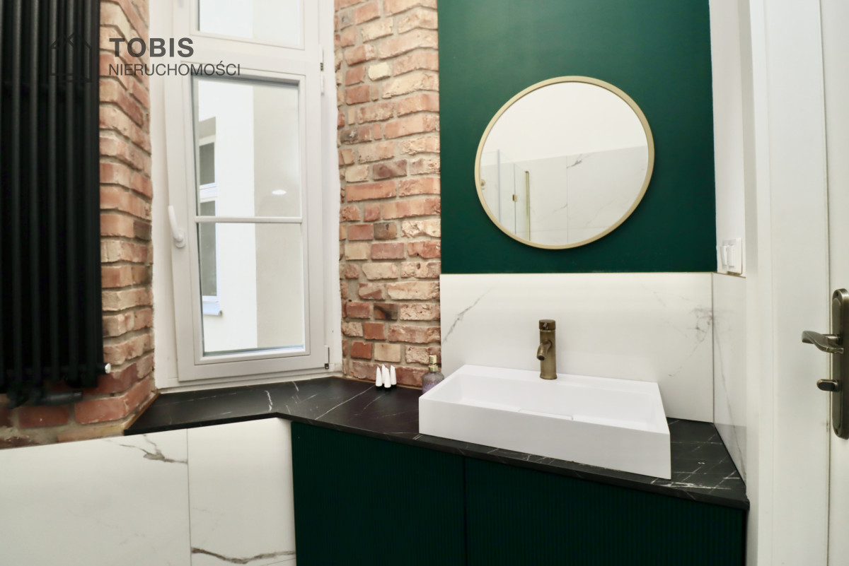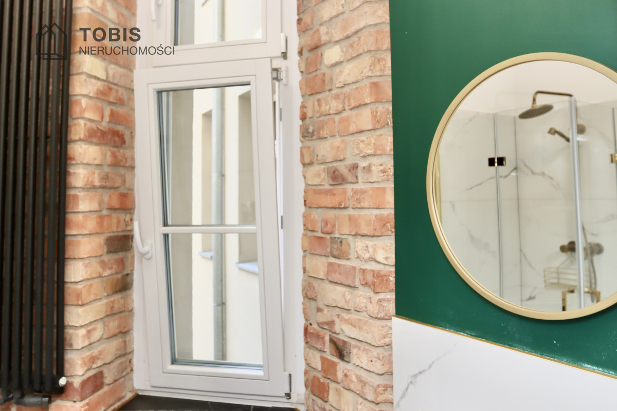 • Oryginalne Detale i Styl: Wnętrze zachwyca połączeniem historycznej architektury z nowoczesnym designem. Znajdziemy tu piękną sztukaterię na suficie oraz oryginalną ścianę z cegły, która stanowi centralny punkt dekoracyjny.