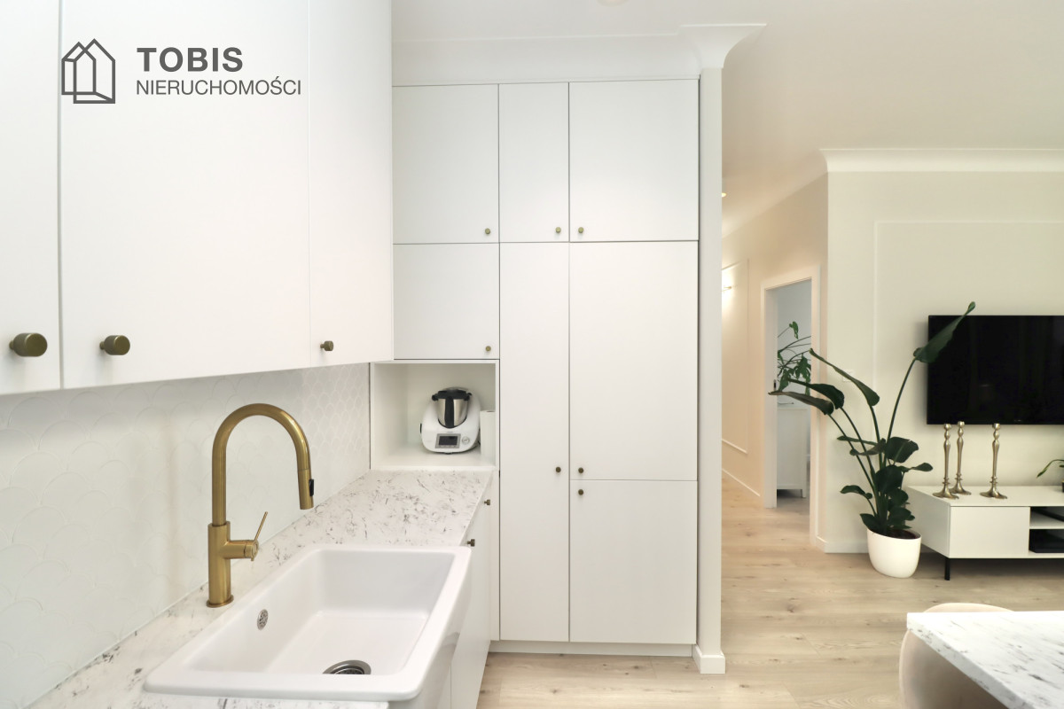 • Funkcjonalna Kuchnia: Nowoczesna zabudowa w neutralnych kolorach z eleganckim wykończeniem w drewnie i białymi frontami – wykonana na zamówienie.