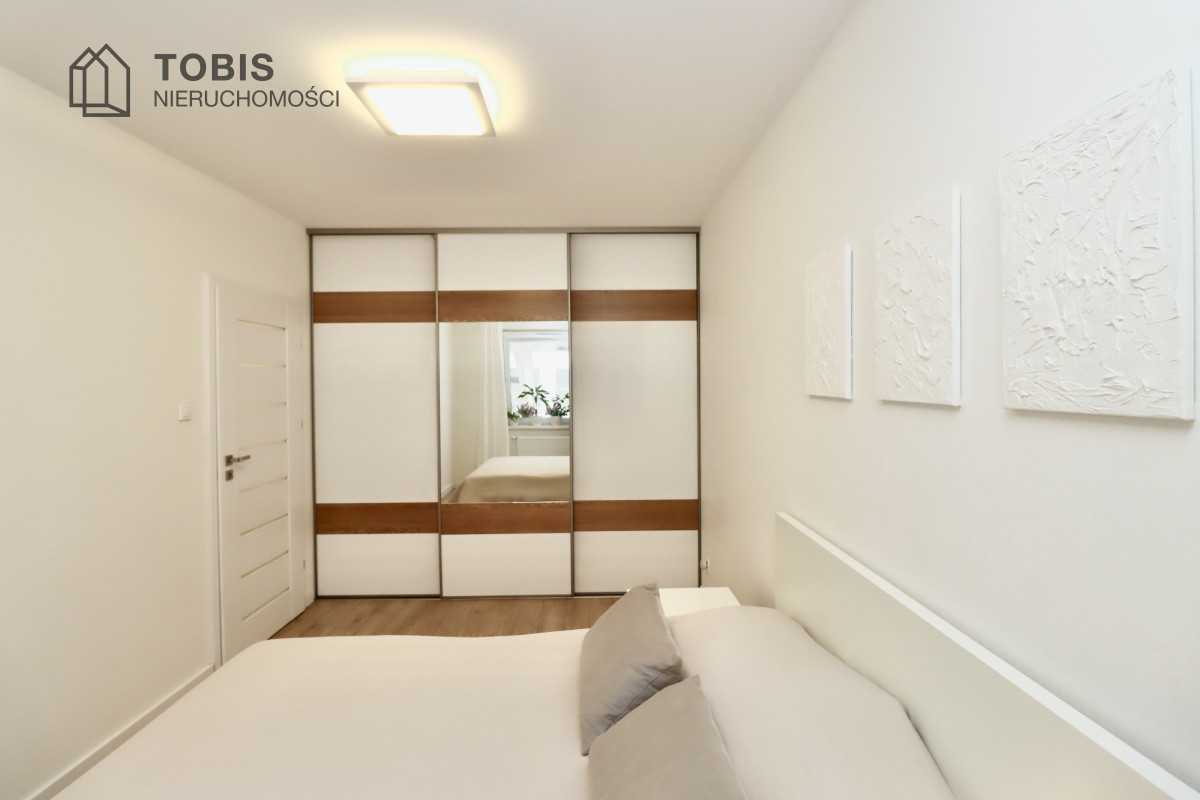 • Sypialnia z Dużą Szafą: Minimalistyczna sypialnia oferuje komfort i spokój. Wyposażona jest w dużą, przesuwną szafę w zabudowie z lustrem i jasnymi panelami, zapewniając mnóstwo miejsca do przechowywania.