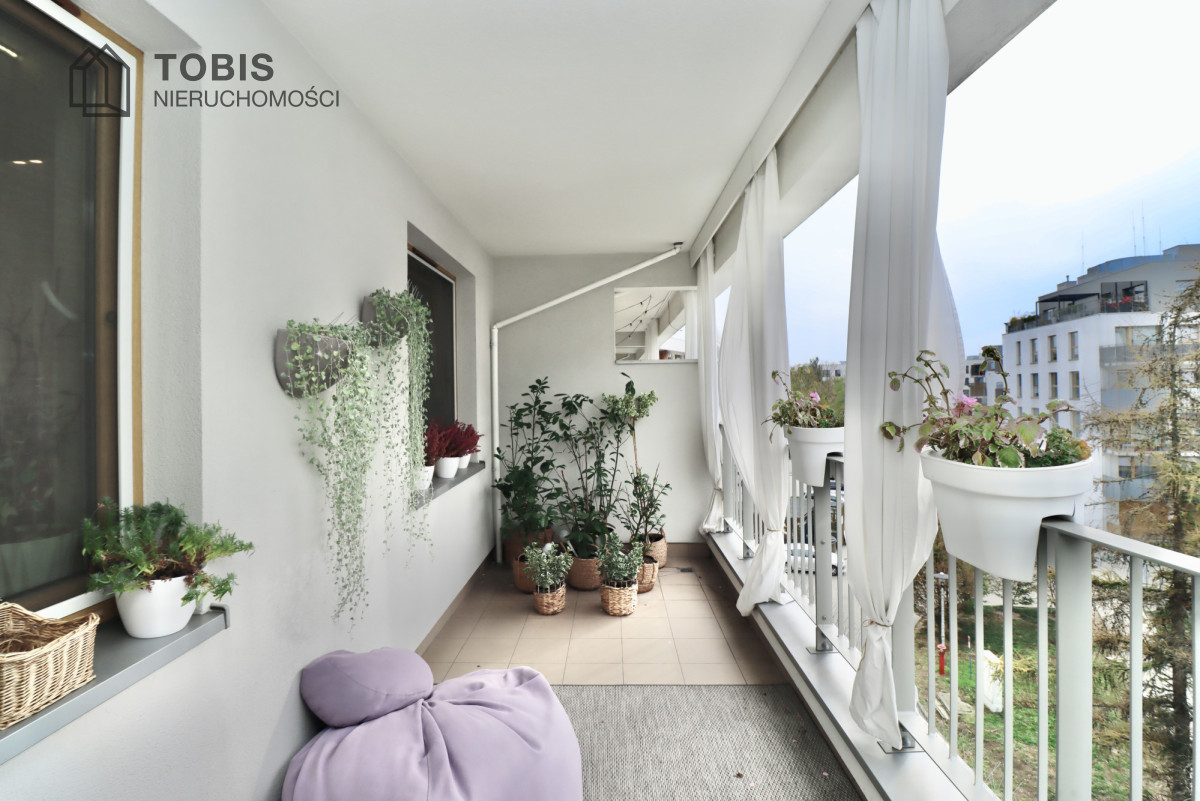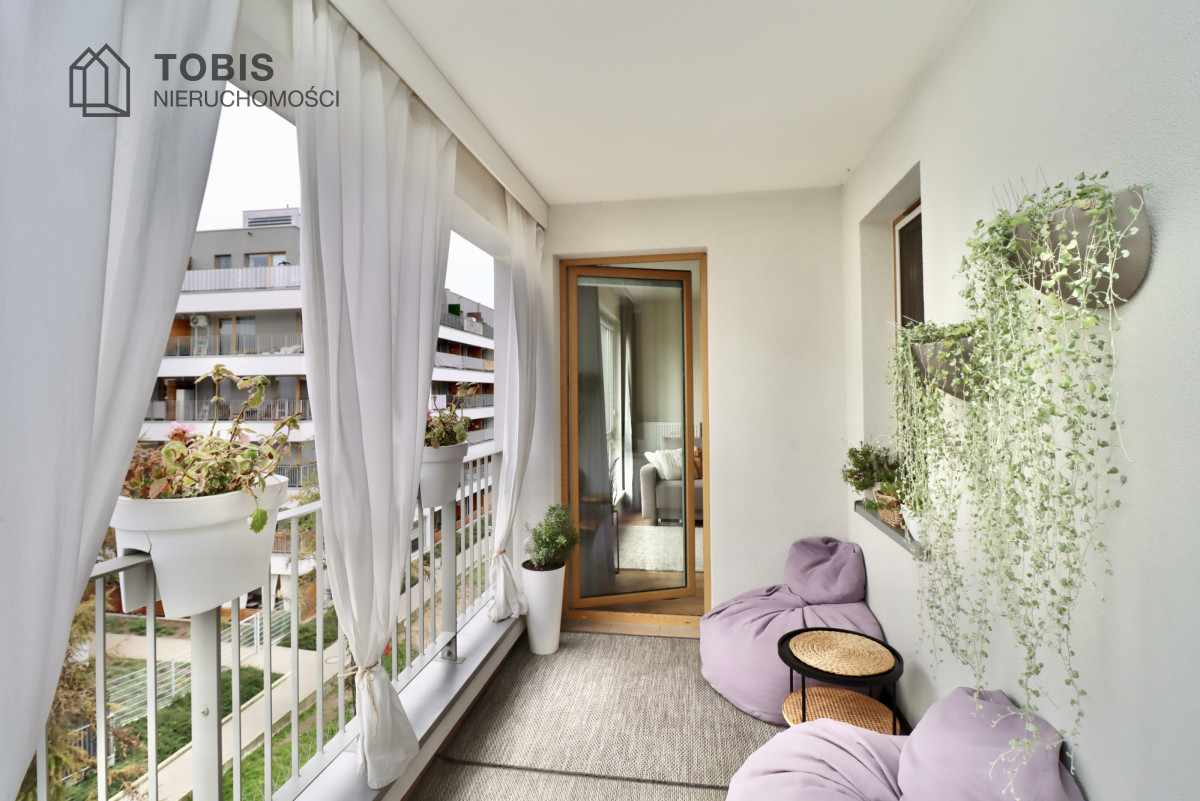 • Przestronny Balkon – Prywatna Oaza: Długi balkon został zaaranżowany jako przytulna strefa relaksu. Zapewnia intymność dzięki bocznym parawanom/zasłonom i jest idealny do popołudniowej kawy w otoczeniu roślin.