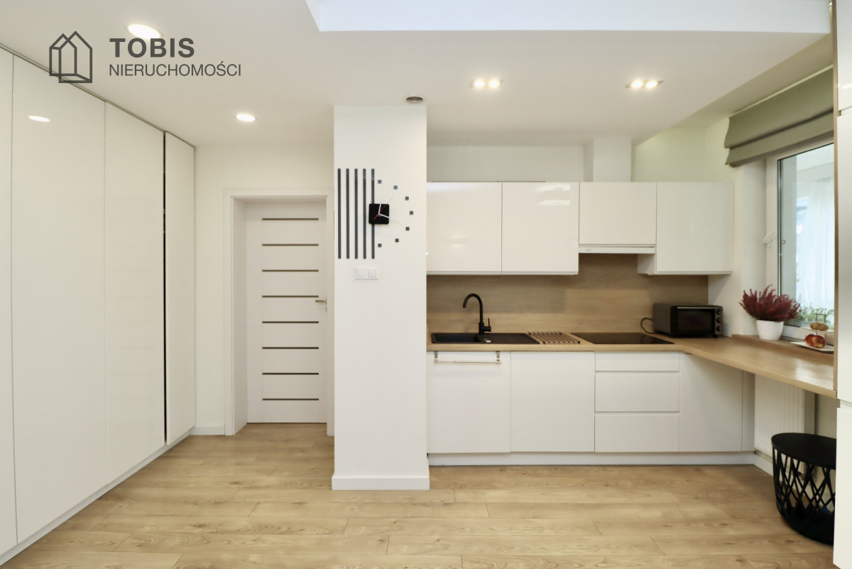 • Designerska Kuchnia: Kuchnia to minimalizm w najlepszym wydaniu: białe, lakierowane fronty w połączeniu z elementami imitującymi drewno. Jest w pełni wyposażona w nowoczesny sprzęt AGD, zapewniając funkcjonalność i estetykę.